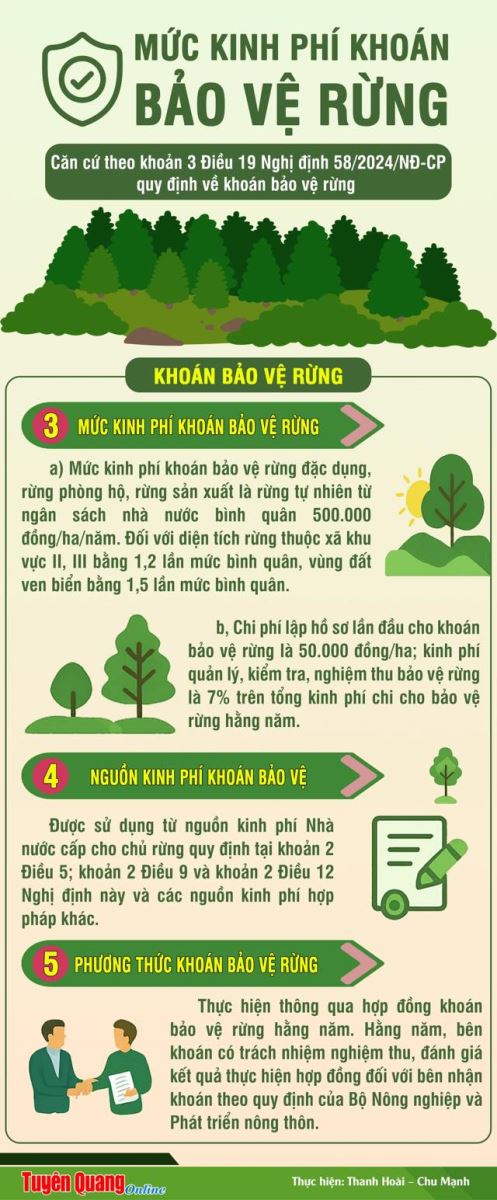 Chính phủ hành Nghị định 58/2024/NĐ-CP về chính sách đầu tư trong lâm nghiệp, trong đó có quy định chi tiết về mức kinh phí bảo vệ rừng đặc dụng, rừng phòng hộ, mức kinh phí khoán bảo vệ rừng bình quân hàng năm